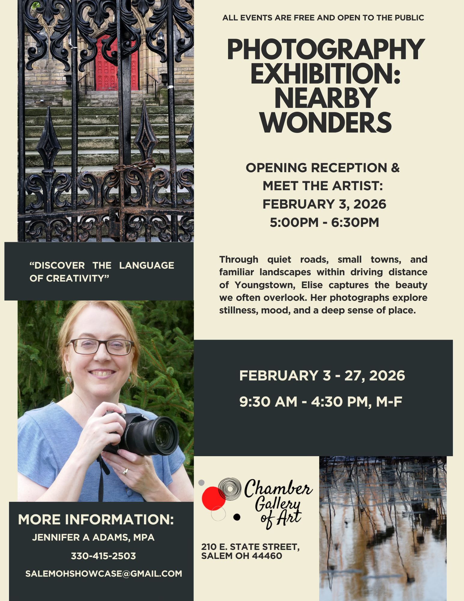 My show “Nearby Wonders” opened Feb. 3 at the Chamber Gallery Art – Salem, OH with a reception. I was thrilled so many of my friends attended. I loved sharing my work with each of them. It’s always interesting to watch people intereact with my photos. And I always enjoy telling them a little about how and when I made the ones they’re particularly interested in. There’s so much more to making a photo than pushing a button – what intrigued me enough to compose and shoot, finding the perfect spot, and more. Those in attendance asked so many great questions and seemed genuinely interested in the story behind my work.