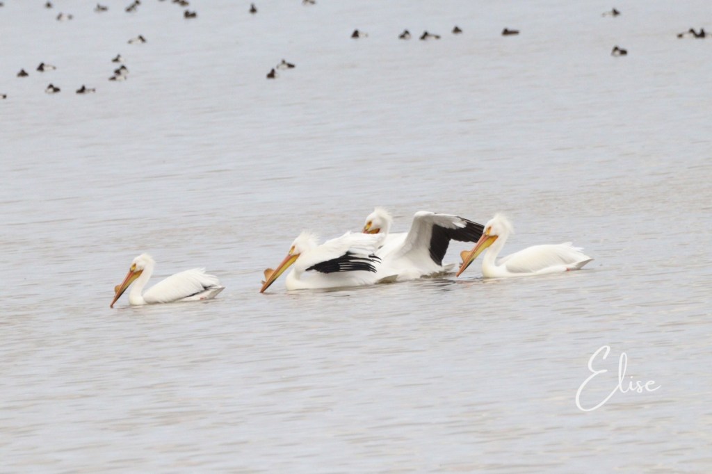 It was chilly as we drove along – it’s open air – but not horrible. We saw American pelicans, trumpeter swans, a woodchuck, great blue herons, great egrets, many red winged blackbirds, and way in the distance lesser scaups. I love the pelicans. I still haven’t gotten THE photo I want but I’m pretty happy with this one.